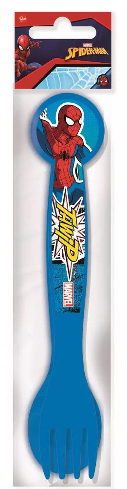 Spiderman s plastovou lžičkou a vidličkou.
